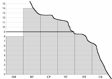 Мальвина всю неделю учила Буратино писать. Она изобразила на диаграмме, сколько букв написал Буратино за каждый из семи дней. Черта на диаграмме показывает среднее число букв (оно равно 9). Буратино оторвал кусок диаграммы, как показано на рисунке. Сколько букв он написал в воскресенье?