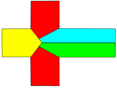 Укажем одно из возможных разбиений на развертке. Пусть длина ребра куба равна 5. Жёлтый и красные пятиугольники состоят из квадрата – грани куба – и треугольника с основанием 5 и высотой 2, то есть имеют площадь 30. Синий и зелёный пятиугольники равны, следовательно, имеют ту же площадь.