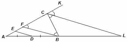 Пусть CL – биссектриса внешнего угла С, D – середина АВ, K – точка на продолжении стороны АС за точку С (см. рис.). Первый способ. Через вершину В проведём прямую, параллельную CL, F – точка её пересечения с прямой АС. Тогда треугольник BCF – равнобедренный. Действительно, ∠СFB = ∠KCL = ∠BCL = ∠СBF, значит, CF = CB.