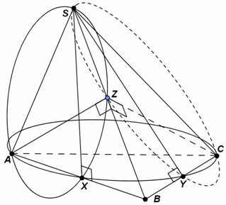 Решение 1: Пусть H – проекция точки S на плоскость ABC, тогда по теореме о трёх перпендикулярах HX ⊥ AB и HY ⊥ BC (рис. слева).