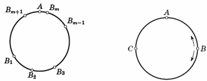 Без ограничения общности будем считать, что все велосипедисты едут по треку против часовой стрелки, причём первый из них – самый быстрый, а третий – самый медленный. Рассмотрим движение велосипедистов в системе отсчета связанной со вторым велосипедистом. Тогда второй велосипедист постоянно находится в некоторой точке A, а первый и третий движутся против и по часовой стрелке соответственно. Они периодически встречаются друг с другом через равные промежутки времени. Обозначим через B1, B2, B3, ... последовательные точки их встреч с начала наблюдения за этими спортсменами (рис. слева). Каждые две соседние точки Bn и Bn+1 (n – произвольное натуральное число) различны, так как первый велосипедист не сможет сделать полный круг против часовой стрелки, не встретившись при этом с третьим. Обозначим через βn меньшую из двух дуг трека с концами Bn, Bn+1. Её длина не превосходит 150 м. Поскольку встречи происходят периодически со сдвигом в одном направлении, все дуги βn равны между собой и объединение нескольких из них покрывает весь трек. Значит, найдётся дуга βm, содержащая точку A. При этом длина одной из дуг BmA или ABm+1 не превосходит 75 м. Таким образом, в какой-то момент встречи первого и третьего велосипедистов они будут находиться от второго велосипедиста не дальше 75 м. Поэтому фотограф заведомо сможет сделать удачный снимок, если d ≥ 75.