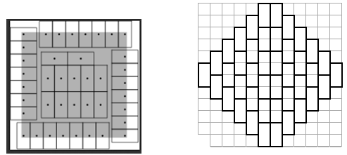 а) Первый способ. Возьмём квадрат с вершинами (4, ±4) и повернём его немного относительно центра так, чтобы его вертикальные стороны не пересекли прямых с полуцелыми абсциссами. Исходный квадрат пересекал восемь таких прямых. После поворота квадрат высекает на них отрезки длины больше 8. Значит, внутри каждого из них можно разместить с шагом 2 по пять центров вертикальных доминошек.