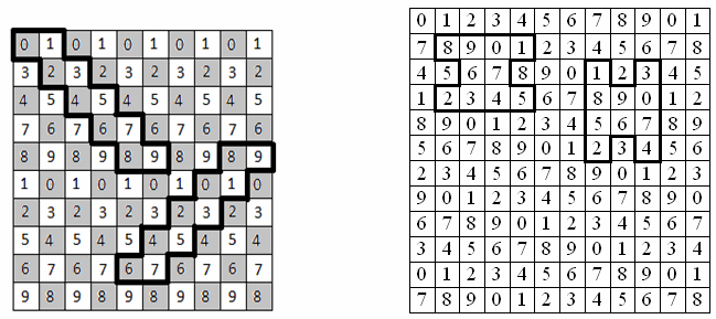 Заменим цвета цифрами. Первый способ. Раскрасим сначала клетки квадрата в шахматном порядке. Занумеруем все белые клетки пятью цифрами так, чтобы любой кусок длины 5 белой диагонали содержал разные цифры. Это легко сделать, так как при повороте квадрата на 45° белые клетки образуют привычную прямоугольную сетку, а куски диагоналей превращаются в прямоугольники 1×5. Аналогично занумеруем чёрные клетки пятью другими цифрами. На рисунке слева приведён пример такой раскраски и два положения Петиного многоугольника. Ясно, что в любом возможном положении он накрывает два диагональных куска длины 5 разного цвета, следовательно, содержит все 10 цифр.