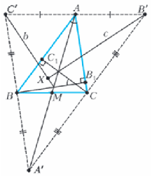 В треугольнике ABC c углом A, равным 45°, проведена медиана AM. Прямая b симметрична прямой AM относительно высоты BB1, а прямая c симметрична прямой AM относительно высоты CC1. Прямые b и c пересеклись в точке X. Докажите, что AX = BC.