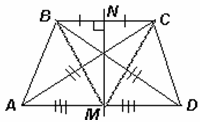 Пусть М и N – середины сторон AD и ВС соответственно. Тогда серединный перпендикуляр MN к отрезку ВС содержит медиану и высоту треугольника ВМС, значит, МВ = МС (см. рис.). Следовательно, треугольники АМС и DMB равны по трём сторонам. Поэтому ∠АМС = ∠DMB, а ∠DМС = ∠AMB (углы, смежные с равными). Значит, треугольники DМС и АМВ равны по двум сторонам и углу между ними, откуда DC = AB.