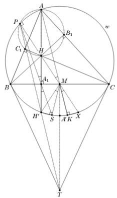 Согласно задаче 156983 AS – симедиана треугольника ABC. Поэтому дуги A'H' и A'X равны, значит, точки H' и X (как и точки S и K) симметричны относительно прямой MT. Лемма 1. Точки P, H, M и X лежат на одной прямой.