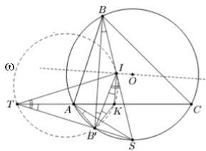Пусть прямая BI вторично пересекает описанную окружность треугольника ABC в точке S, а лучи SB' и CA пересекаются в точке T (см. рис.). По лемме о трезубце (см. задачу 153119) SA = SC = SI. Из симметрии ∠IB'B = ∠IBB' = φ. Так как OB = OB', четырёхугольник AB'SB вписан, откуда ∠SAB' = ∠SBB' = φ. Заметим, что ∠ATS = ∠СAS = ∠CBS – ∠ABB' = ∠ABS – ∠ABB' = ∠SBB' = φ.