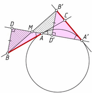 Решение 1:Докажем, что равны перпендикуляры BD и B'D', опущенные на прямую AA'. Когда AA' – диаметр, это очевидно. Иначе треугольники ABD и AB'D' равны по гипотенузе и острому углу. Поэтому BDB'D' – параллелограмм, и прямая AA', содержащая его диагональ DD', делит другую диагональ пополам.