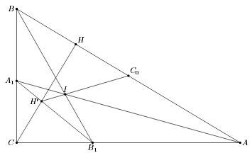 Обозначим точку пересечения C0I и CH через H' (см. рис.). Согласно задаче 153133 CH' = r, поэтому расстояния da, db, dc от H' до прямых BC, AC и AB равны соответственно r cos ∠HCB = r cos∠B = r·AC/AB, r·BC/AB и dc = CH – r. Из равенств (AB + BC + CA)r = 2SABC = AB·CH следует, что dc = da + db. Очевидно, что этим свойством обладают также расстояния от точек A1, B1 до прямых BC, CA и AB. Из теоремы Фалеса следует, что все точки, обладающие этим свойством, лежат на прямой A1B1.