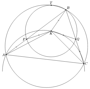 AP = CQ, AT = CT и ∠PAT = ∠QCT, треугольники TAP и TCQ равны, то есть ∠TPB = ∠TQB и точка T лежит на ω. Значит, центр K этой окружности лежит на серединном перпендикуляре к BT. Кроме того, из условия следует, что ∠AKC = 3∠B/2, то есть K лежит на соответствующей дуге (см. рис.).