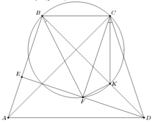 EDB = 45° – (90° – ∠A) = ∠A – 45° = ∠BDC. Значит, точка B равноудалена от прямых DE и DC. Поскольку трапеция равнобедренная, расстояние от B до DC равно расстоянию от C до AB, которое, в свою очередь, равно расстоянию от B до параллельной AB прямой CF. Следовательно, BF – биссектриса угла CFE, то есть ∠BFC = 45°. Пусть перпендикуляр к BF, восставленный из точки F, пересекает BD в точке K. Тогда