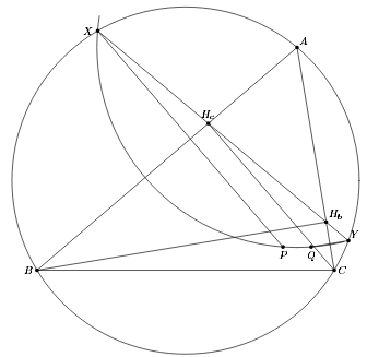AO ⊥ HbHc, то есть AO – серединный перпендикуляр к отрезку XY. Следовательно, AP = AX = AY = AQ, то есть точки P, X, Y, Q лежат на окружности с центром A (см. рис.). Поэтому прямые XY и PQ антипараллельны относительно прямых XP и YQ, которые параллельны высотам треугольника. Но BC и HbHc также антипараллельны относительно высот, значит, PQ || BC.