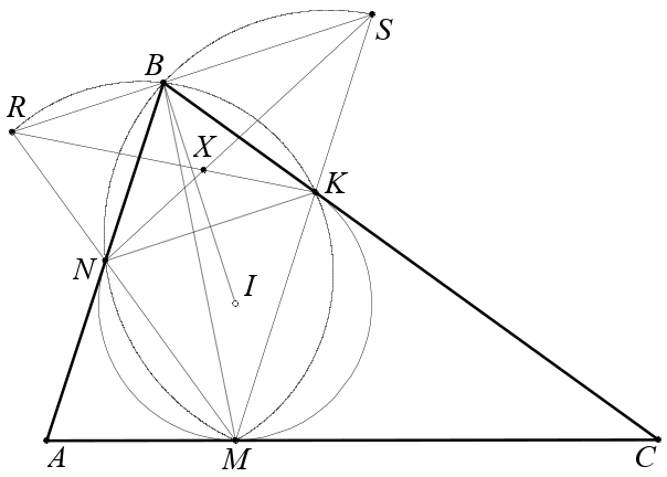 Пусть $X$ – точка пересечения $RK$ и $SN$. Прямые $NK$ и $RS$ параллельны, поскольку перпендикулярны биссектрисе угла $B$. Угол $NMK$ равен углу $NKB$ между касательной и хордой, а последний – углу $SBK$ по доказанной параллельности. Следовательно, четырёхугольник $RBKM$ вписанный. Поэтому $\angle RKM = \angle RBM$. Аналогично $\angle SNM = \angle SBM$. Но углы $RBM$ и $SBM$ дают в сумме 180°, значит, и углы $XKM$ и $XNM$ – тоже. Следовательно, четырёхугольник $NMKX$ вписанный, что и требовалось.