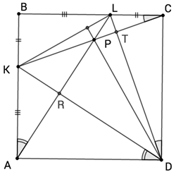 На стороне AB квадрата ABCD отмечена точка K, а на стороне BC – точка L так, что KB = LC. Отрезки AL и CK пересекаются в точке P. Докажите, что отрезки DP и KL перпендикулярны.