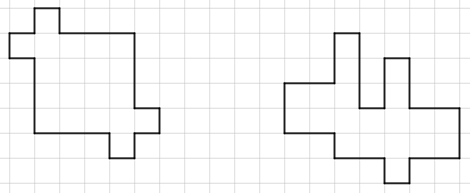 Разрежьте фигуру, изображенную слева, по линиям сетки на две равные части и покажите, как из них сложить фигуру, изображенную справа. (Фигуры можно поворачивать и переворачивать. Равными называются фигуры, которые совмещаются при наложении).