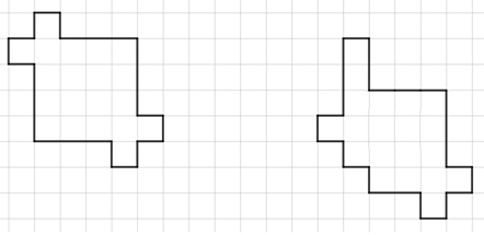 Разрежьте фигуру, изображенную слева, по линиям сетки на две равные части и покажите, как из них сложить фигуру, изображенную справа. (Фигуры можно поворачивать и переворачивать. Равными называются фигуры, которые совмещаются при наложении).