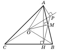 Помимо того, $$\angle CAH = 90^\circ - \angle ACB = 90^\circ - \frac{\angle AOB}{2} =90^\circ - \angle AOM = \angle OAM.$$ Получаем: $$\angle CPM = \angle OAM = \angle CAH = \angle CPH.$$ Значит, точки $M$, $P$ и $H$ лежат на одной прямой.