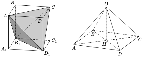 Поэтому нужно в исходной правильной четырёхугольной пирамиде $OABCD$ с вершиной $O$ провести высоту $OH$ и разрезать пирамиду плоскостями $OHA$ и $OHB$ на 4 одинаковые части (см. рисунок справа). Приклеив к каждой грани исходного правильного тетраэдра по одной из полученных частей, мы получим куб с ребром $\frac{1}{\sqrt2}$.