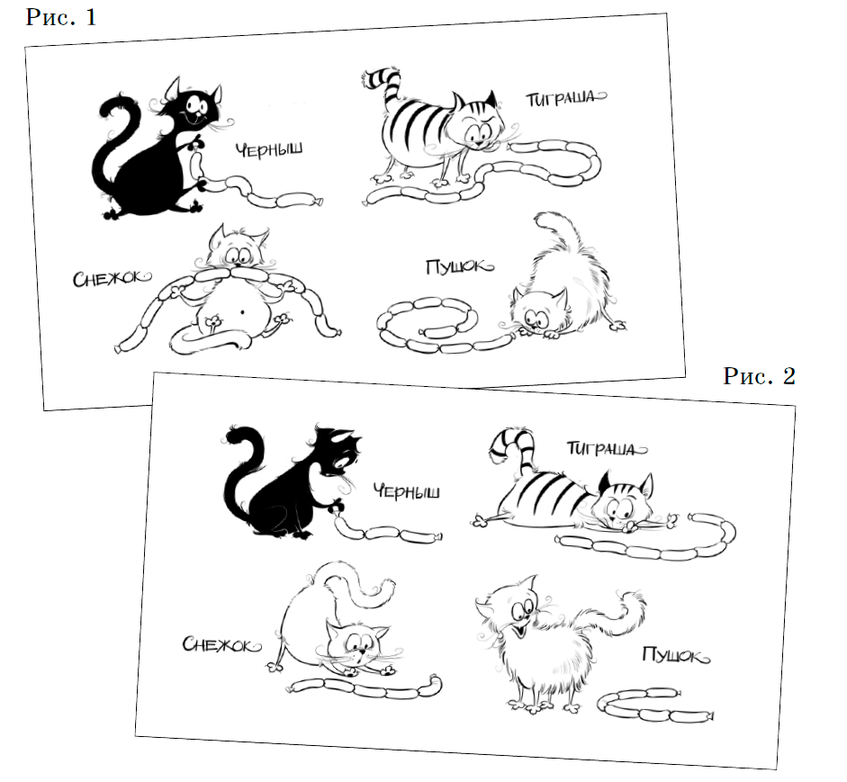 Таня сфотографировала четырёх котиков, поедающих сосиски (рис. 1). Вскоре она сделала ещё один кадр (рис. 2). Каждый котик ест свои сосиски непрерывно и с постоянной скоростью, а на чужие не покушается. Кто доест первым и кто последним? Ответ объясните.