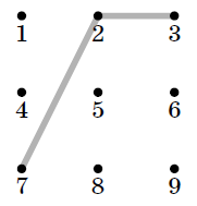 Ваня придумывает число из неповторяющихся цифр без нулей – пароль для своего телефона. Пароль работает так: если, не отрывая палец от экрана, последовательно соединить отрезками точки, соответствующие цифрам пароля, телефон разблокируется. При этом телефон не позволяет соединять отрезком две точки, между которыми есть третья: если Ваня соединит, например, 1 и 3, телефон "подумает", что Ваня вводит 1-2-3.