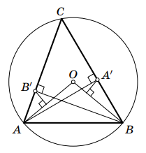 В остроугольном треугольнике ABC проведены высоты AA' и BB'. Точка O – центр окружности, описанной около треугольника ABC. Докажите, что расстояние от точки A' до прямой B' равно расстоянию от точки B' до прямой A'.