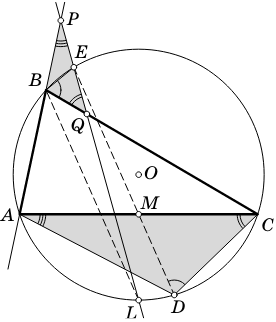 Без ограничения общности, будем считать, что точка $P$ лежит на продолжении $AB$. Учитывая, что между параллельными хордами $BL$ и $ED$ заключены равные дуги, а биссектриса $BL$ делит дугу $AC$ на две равных, запишем: $$ \angle P = \frac{\smile AL - \smile BE}{2} = \frac{\smile CL - \smile DL}{2} = \frac{\smile CD}{2} = \angle A. $$ И аналогично $$ \angle Q = \frac{\smile CL + \smile BE}{2} = \frac{\smile AL + \smile LD}{2} = \frac{\smile AD}{2} = \angle C. $$ Следовательно, $\triangle BPQ \sim \triangle DAC$. Осталось заметить, что $\angle QBE$ и $\angle CDM$ равны, так как опираются на одну дугу. Значит, медиане $DM$ соответствует отрезок $BE$, и он сам является медианой $\triangle BPQ, PE = EQ$. Второе решение. Это решение основано на работе Якова Богданова. Пусть прямая $EM$ пересекает $AB$ и $BC$ в точках $P'$ и $Q'$ соответственно. Также обозначим $\angle BAE = \angle BLE = \angle BCE = \angle QEQ' = \angle PEP' = \alpha $ и $\angle ABL = \angle CBL = \angle AEM = \angle CEM = \beta$ (указанные углы равны, как опирающиеся на одну дугу и углы при параллельных прямых). Последовательно применяя теорему синусов для треугольников $\triangle PP'E$, $\triangle AP'E$ и $\triangle AP'M$, получим: \begin{align*} PE &= \frac{P'E \cdot \sin \beta}{\sin (\beta - \alpha)} = \frac{AP'\cdot \sin \alpha \cdot \sin \beta}{\sin (\beta + \alpha) \cdot \sin(\beta - \alpha)} = \ &= \frac{AM \cdot \sin \angle EMA \cdot \sin \alpha \cdot \sin \beta}{\sin \beta \cdot \sin (\beta + \alpha) \cdot \sin (\beta -\alpha)} = \frac{AC \cdot \sin \angle EMA \cdot \sin \alpha}{2 \cdot \sin (\beta + \alpha) \cdot \sin (\beta - \alpha)}. \end{align*} Аналогично, применяя теорему синусов для треугольников $\triangle QQ'E$, $\triangle CQ'E$ и $\triangle CQ'M$, получим: $$QE = \frac{CM \cdot \sin \angle EMC \cdot \sin \alpha \cdot \sin \beta}{\sin \beta \cdot \sin (\beta + \alpha) \cdot \sin (\beta - \alpha)} = \frac{AC \cdot \sin \angle EMA \cdot \sin \alpha}{2 \cdot \sin (\beta + \alpha) \cdot \sin (\beta - \alpha)}.$$ То есть $PE=QE$, что и требовалось доказать.