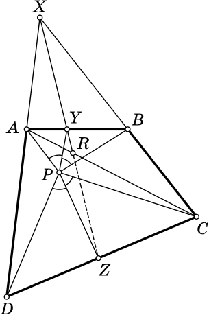 Рассмотрим $\bigtriangleup PBC$ и внешнюю биссектрису $XP$ угла $BPC$, $\bigtriangleup APB$ и биссектрису $PY$ угла $APB$, $\bigtriangleup PCD$ и биссектрису $PZ$ угла $DPC$, $\bigtriangleup APD$ и внешнюю биссектрису $XP$ угла $APD$. Из свойства биссектрисы