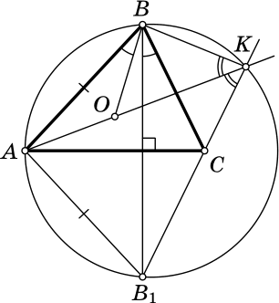 откуда $\angle BB_1C = 90^{\circ} -\angle C$. Следовательно, четырехугольник $ABKB_1$ вписанный (см. рисунок).