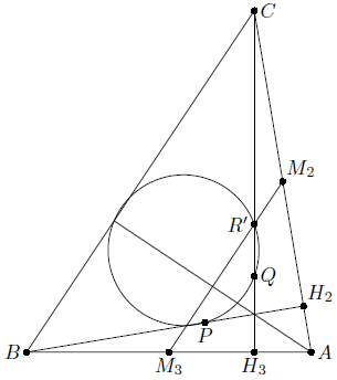 $$\angle{QH_1R'} = \angle{HH_1Q} - \angle{HH_1R'} = \angle{M_3AR'} - \angle{R'AH_1} = \angle{BAH_1} = \angle{R'PQ}.$$
