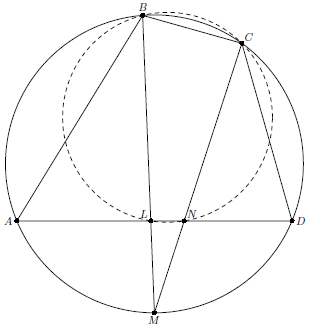 Пусть $M$ – середина дуги $AD$. Тогда прямые $BL$ и $CN$ проходят через $M$. Кроме того, из равенства дуг $AM$ и $DM$ следует, что $\angle ALB = \big(\smile AB + \smile DM \big)/2 = \smile BAM/2=\angle BCM$, и, значит, четырехугольник $BCNL$ – вписанный. Следовательно, $ML\cdot MB = MN\cdot MC$, и $M$ лежит на радикальной оси $PQ$ окружностей $ABL$ и $CDN$.