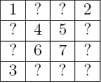 В квадрате $4\times4$ расставили целые числа так, что в каждом из восьми рядов (строках и столбцах) сумма чисел одна и та же. Семь чисел известны, а остальные скрыты (см. рисунок).