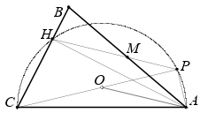 $\angle B = \frac{1}{2}\angle AOC$ = 90° – $\angle OCA = \angle PAC =\angle PHB$ (последнее равенство следует из очевидной вписанности четырёхугольника $APHC$). Значит, луч $HP$ отсекает от прямоугольного треугольника $ABH$ равнобедренный треугольник $BMH$. Поэтому $M$ – середина $AB$.