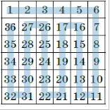 Пронумеруем столбцы и строки от 1 до $n$ соответственно слева направо и сверху вниз, а также раскрасим доску в шахматном порядке так, чтобы угловая клетка в первом столбце и первой строке была чёрной. Пусть $n$ чётно. Заполним таблицу числами от 1 до $n^2$ так: ставим их друг за другом, начиная от 1, сначала в первой строке слева направо, а потом – вдоль столбцов: вниз по последнему столбцу, вверх по предпоследнему, и т.д. (получается что-то похожее на змейку). В итоге число $n^2$ окажется прямо под 1, см. пример для $n$ = 6 на рисунке.