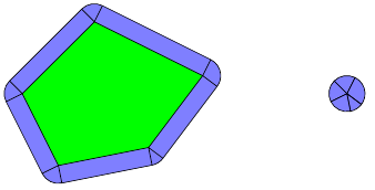 Добавленная площадь равна сумме площадей прямоугольников и площадей секторов. Сумма площадей прямоугольников равна произведению ширины (равной $1$) на сумму длин сторон пятиугольника: $1\cdot 20$.