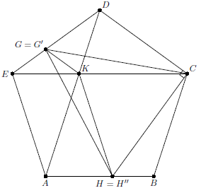 Тогда $\angle DG'K=\angle DKG'=72^{\circ}$, т.е. $DG'=DK=EK=AH'$. Кроме того, $KH'=EA=CD=KC$ и $\angle G'KC=\angle G'KH'=144^{\circ}$. Следовательно, треугольники $CKG'$ и $H'KG'$ равны, т.е. $G'H'=G'C=H'E$ и точки $H'$, $G'$ совпадают с $H$, $G$. При этом $HC\perp GK\parallel CD$, ч.т.д.