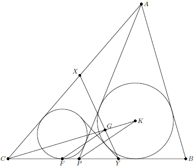 Пусть $P$ – произвольная точка на стороне $BC$ треугольника $ABC$, $K$ – центр вписанной окружности треугольника $PAB$, а $F$ – точка касания вписанной окружности треугольника $PAC$ со стороной $BC$. Точка $G$ на $CK$ такова, что $FG\parallel PK$. Найдите геометрическое место точек $G$.