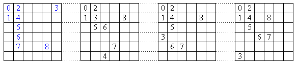 На рисунках приведены примеры Квадрландий. Пустые клетки – королевства, а цифра в клетке обозначает, сколько королевств претендует на эту спорную территорию.