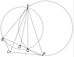 Даны две окружности, пересекающиеся в точках $P$ и $Q$. Произвольная прямая $l$, проходящая через $Q$, повторно пересекает окружности в точках $A$ и $B$. Прямые, касающиеся окружностей в точках $A$ и $B$, пересекаются в точке $C$, а биссектриса угла $CPQ$ пересекает прямую $AB$ в точке $D$. Докажите, что все точки $D$, которые можно так получить, выбирая по-разному прямую $l$, лежат на одной окружности.