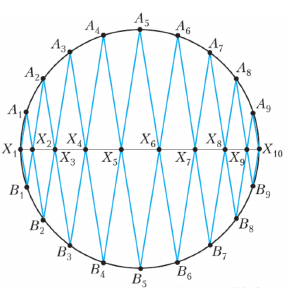 $$\angle X_1B_1A_2 = \angle A_2B_3A_4 = \angle A_4B_5A_6 = \angle A_6B_7A_8 = \angle A_8B_9X_{10} = \alpha.$$ Следовательно, $5\alpha$ равно половине дуги ${X_1X_{10}}$, то есть $90^\circ$.