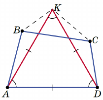 б) Пусть каждый из углов $B$ и $C$ меньше $120^\circ$. Продлим лучи $AB$ и $DC$, дополнительные углы будут больше $60^\circ$. Построим на стороне $BC$ равносторонний треугольник $BKC$ во внешнюю сторону четырёхугольника. Тогда угол $AKD$ будет меньше $60^\circ$ (стороны $BK$ и $CK$ «загибаются внутрь» от лучей), и значит, в треугольнике $AKD$ сторона $AD$ не самая большая. Пусть она меньше, например, чем $AK$. Тогда получаем: $AD < AK < AB+BK=AB+BC$ — противоречие.