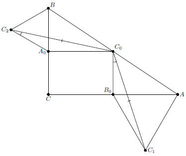 Так как $C_0B_0=A_0B=A_0C_2$, $C_0A_0=AB_0=B_0C_1$ и $\angle C_0A_0C_2=\angle C_0B_0C_1=150^{\circ}$, то треугольники $C_0A_0C_2$ и $C_1B_0C_0$ равны. Поэтому $C_0C_1=C_0C_2$ и $\angle C_1C_0C_2=\angle A_0C_0B_0+\angle B_0C_0C_1+\angle A_0C_0C_2=120^{\circ}$. Следовательно, $\angle C_0C_1C_2=\angle C_0C_2C_1=30^{\circ}$.