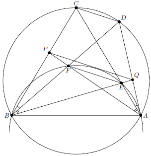 Четырехугольник $ABCD$ – вписанный. Окружность, проходящая через точки $A$ и $B$, пересекает диагонали $AC$ и $BD$ в точках $E$ и $F$ соответственно. Пусть прямые $AF$ и $BC$ пересекаются в точке $P$, а прямые $BE$ и $AD$ – в точке $Q$. Докажите, что $PQ$ параллельна $CD$.