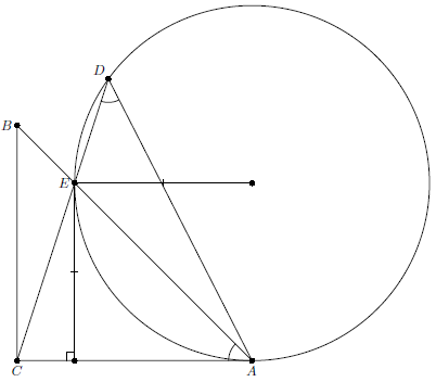 По теореме синусов радиус описанной окружности треугольника $ADE$ равен $AE/2\sin\angle ADE$. С другой стороны, расстояние от $E$ до $AC$ равно $AE\sin\angle BAC$. Тогда из условия задачи следует, что $2\sin^2\angle A=1$, т.е. $\angle A=45^{\circ}$.