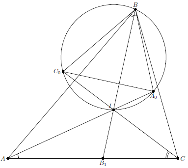 Для решения задачи достаточно доказать подобие четырехугольников $A_0IC_0B$ и $A'BC'B'$. Действительно, так как четырехугольник $A'BC'B'$ вписанный, окружность $A_0IC_0$ проходит через $B$. Также из параллельности прямых $A_0C_0$ и $A'C'$ получаем, что окружности $A_0IC_0$ и $A'IC'$ касаются в точке $I$. Симметрия относительно $A'C'$ сохраняет первую окружность, проходящую через $B$ и $I$, а вторую переводит в описанную около треугольника $ABC$. Следовательно, окружности $A_0IC_0$ и $ABC$ касаются в точке $B$.
