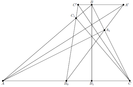 Высоты $AA_1$, $CC_1$ остроугольного треугольника $ABC$ пересекаются в точке $H$; $B_0$ – середина стороны $AC$. Прямая, проходящая через вершину $B$ параллельно $AC$, пересекает прямые $B_0A_1$, $B_0C_1$ в точках $A'$, $C'$ соответственно. Докажите, что прямые $AA'$, $CC'$, $BH$ пересекаются в одной точке.