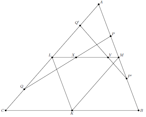 Применяя к треугольнику $ALM$ и прямой $\ell$ теорему Менелая, получаем $LX:XM=(LQ:QA)\cdot (AP:PM)$. Аналогично получаем $LY:YM=(LQ':Q'A)\cdot (AP':P'M)=(LQ:Q'A)\cdot (AP':PM)$. Так как $QA > Q'A$ и $AP < A'P$, то $LX:XM < LY:YM$.
