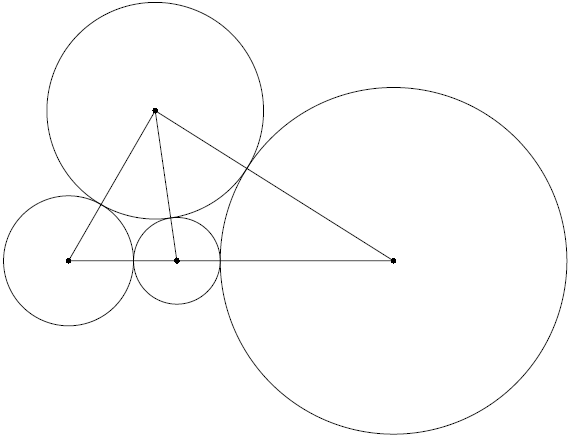 Будем искать конструкцию с четырьмя монетами (очевидно, трех монет недостаточно). Пусть монеты с радиусами $a$, $b$, $x$, $y$ расположены так, что любые две из них, кроме монет с радиусами $x$ и $y$ касаются. Обозначим через $O_r$ центр окружности с радиусом $r$. Применяя теорему косинусов к треугольнику $O_aO_bO_x$, получаем $\cos\angle O_bO_aO_x=((a+b)^2+(a+x)^2-(b+x)^2)/2(a+b)(a+x)$. Аналогично, $\cos\angle O_bO_aO_y=((a+b)^2+(a+y)^2-(b+y)^2)/2(a+b)(a+y)$. Чтобы точки $O_a$, $O_x$ и $O_y$ лежали на одной прямой, необходимо и достаточно, чтобы сумма этих выражений равнялась нулю, что эквивалентно равенству $(b-a)(ax+ay+2xy)=a(a+ b)(2a+x+y)$. Непосредственная проверка показывает, что оно выполнено при $a=2$, $b=5$, $x=3$, $y=8$ (см.рис., косинусы равны $\frac17$ и $-\frac17$).