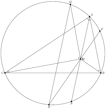 Докажем, что четырехугольник $APNQ$ гармонический. Пусть $PM$ вторично пересекает $k$ в точке $R$. Тогда $\angle NMR=90^{\circ}-\angle BMN$, $\angle AMQ=\angle AMC-90^{\circ}$. Поскольку $\angle BMN+\angle AMC=\angle BAC+\angle BNC=180^{\circ}$, то $\angle NMR=\angle AMQ$, вместе с равенством $AM=MN$ это означает, что точки $Q$ и $R$ симметричны относительно серединного перпендикуляра к $AN$. Следовательно, $\smile AQ=\smile NR$ (см.рис.), а значит, $\angle MPN=\angle NPR=\angle APQ=\angle ANQ=\angle MNQ$. Аналогично, $\angle MQN=\angle AQP=\angle MNP$. Поэтому треугольники $APQ$, $MPN$ и $MNQ$ подобны и $APNQ$ – гармонический четырехугольник.