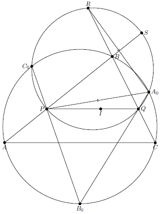 Будем считать, что $AB\not=BC$ (в противном случае утверждение задачи очевидно). Касательная $t$ к окружности $ABC$ в точке $B$ касается также окружности $BPQ$. Поэтому прямые $A_0C_0$, $PQ$ и $t$ пересекаются в одной точке – радикальном центре $X$ окружностей $ABC$, $BPQ$ и $PQRS$. Кроме того, $A_0C_0$ образует равные углы с $AC$ и $t$, т.е. является биссектрисой угла $BXP$. А поскольку центр $I$ вписанной окружности треугольника $ABC$ симметричен $B$ относительно $A_0C_0$, то $I$ лежит на $PQ$. При этом $IQ=QC$, $IA_0=A_0C$ и, значит, прямая $A_0Q$ проходит через середину $B_0$ дуги $AC$. Аналогично получаем, что $C_0P$ проходит через $B_0$.