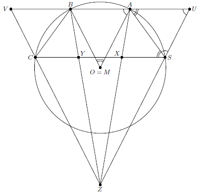 Пусть $U$, $V$ – такие точки на прямой $AB$, что $UA=AB=BV$. Тогда прямые $US$ и $CV$ проходят через $Z$, а параллельные им прямые, проходящие через $A$ и $B$ соответственно, пересекаются в центре тяжести $M$ треугольника $ABZ$. Поскольку $UA=AS$, $VB=BC$, получаем, что $\angle AUS=\angle ASU=\angle MAB=\angle MBA$ и $\angle AMB=\angle UAS=\angle ASC=2\angle ASB=\angle AOB$. Следовательно, $M$ совпадает с $O$.